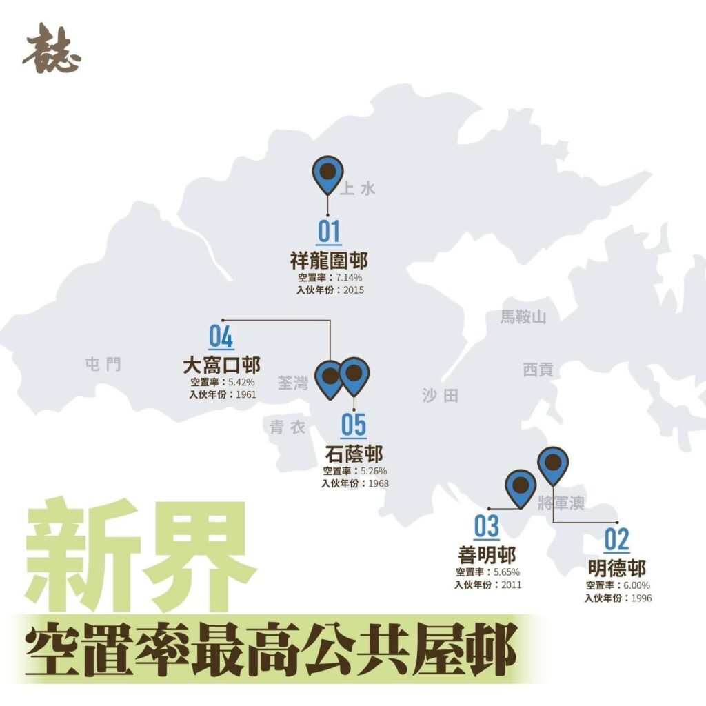 另一方面,市區公屋的空置率亦高於新界地區,其中多條樓齡逾40年的市區老舊公屋估算空置率逾5%,集中在深水埗和觀塘(見表)。