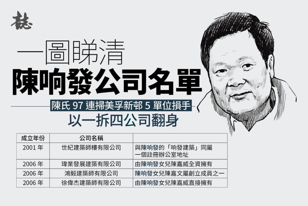 09/01/2026 社會 【宏福苑大火|調查篇】九七金融風暴投資損手 陳响發家族分拆公司重新起步 「鴻毅建築師」前身「世紀建築師」貪污罪成 同涉「丘瑞田」案 鴻毅建築師有限公司(下稱:鴻毅建築師)的創辦人之一沈鉅忠,於2005年辭去世紀建築師樓有限公司(下稱:世紀建築師樓)董事,並將股份轉讓給陳响發女兒陳嘉威。其後,2006年沈鉅忠與維修界老行尊陳响發的另